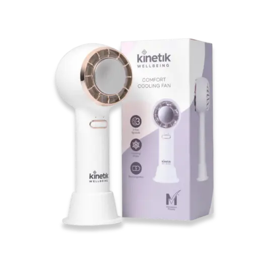 Kinetik Wellbeing’s Cooling Fan offers quick hot flush relief, while the Thermal Comforter provides soothing support for muscle tension and night sweats. Together, these products deliver natural, effective menopause support so women can feel more comfortable and in control every day