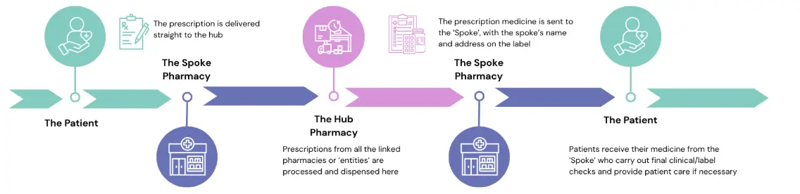 The Hub and Spoke Flow between patient, the spoke pharmacy and hub.